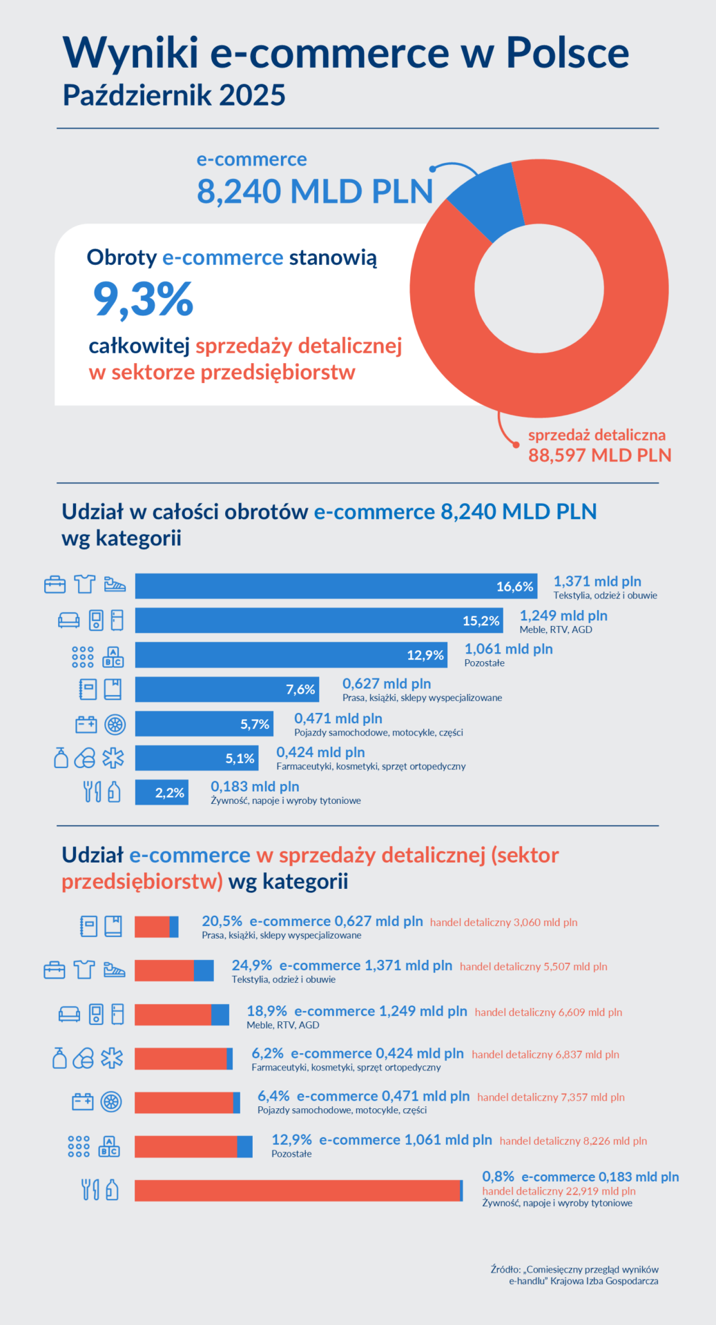 Obroty w e-handlu w październiku 2025 roku stanowiły 9,3% obrotów handlu detalicznego realizowanych w sektorze przedsiębiorstw (88,597 mld PLN) i osiągnęły wartość 8,240 mld PLN. Były one o 10,5% większe niż we wrześniu. Wzrost miał charakter sezonowy. Wyniki okazały się o 8,6% wyższe niż przed rokiem.