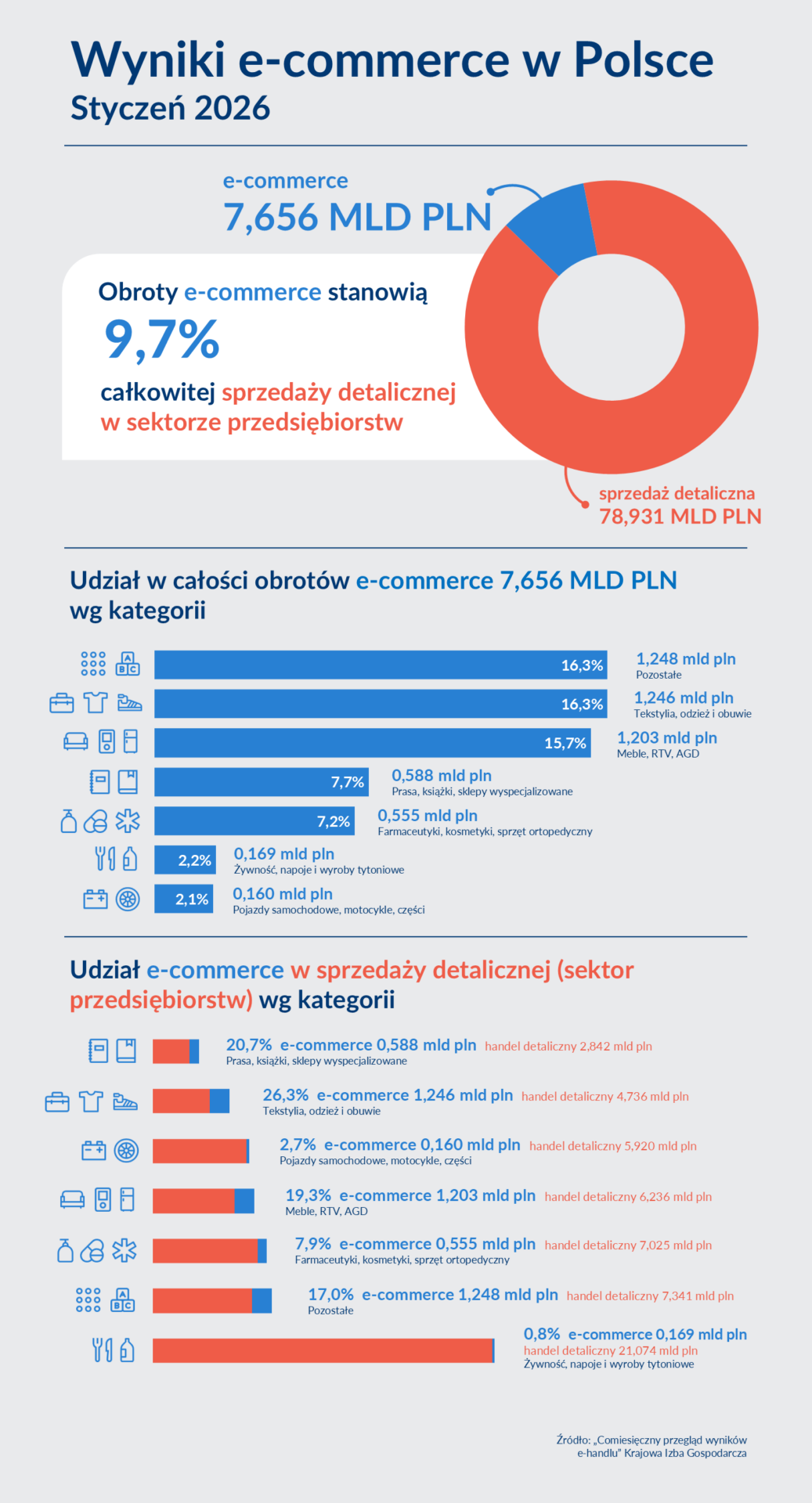 Obroty w e-handlu w styczniu 2026 roku stanowiły 9,7% obrotów handlu detalicznego realizowanych w sektorze przedsiębiorstw (78,931 mld PLN) i osiągnęły wartość 7,656 mld PLN. Były one o 21,4% mniejsze niż w grudniu. Spadek miał charakter sezonowy. Wyniki okazały się o 10,9% wyższe niż przed rokiem.