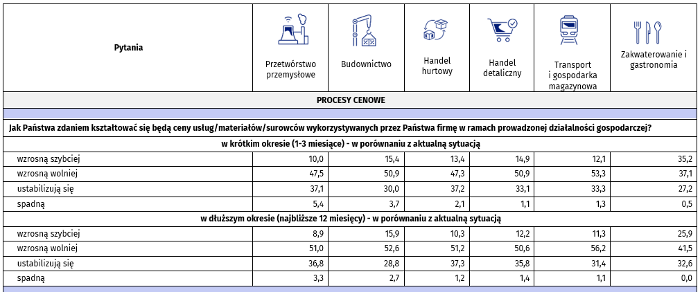 Wolniejszy wzrost cen w kolejnych 3 miesiącach przewiduje m.in. 53,3% przedsiębiorców z transportu i gospodarki magazynowej; 50,9% z handlu detalicznego i budownictwa. Z kolei szybszego wzrostu cen oczekuje m.in. 35,2%% ankietowanych z zakwaterowania i gastronomii; 15,4% przedsiębiorców reprezentujących budownictwo.