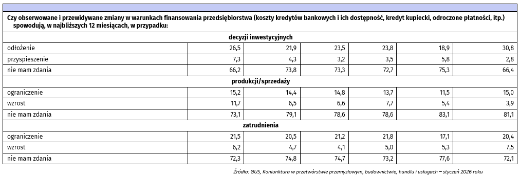 Zgodnie ze styczniową ankietą tylko trzy branże notują dodatni poziom wskaźnika ogólnego klimatu koniunktury (niewyrównywany sezonowo). Oznacza to, że we wskazanych branżach odsetek przedsiębiorców spodziewających się poprawy sytuacji gospodarczej w najbliższych trzech miesiącach lub obserwujących taką poprawę, przeważa nad odsetkiem przedsiębiorców oczekujących pogorszenia. Branże z dodatnim wskaźnikiem to: finanse i ubezpieczenia (plus 25,4); informacja i komunikacja (plus 12,1); zakwaterowanie i gastronomia (plus 3,0).