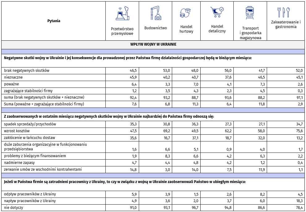 Ankieta GUS porusza również kwestię wpływu wojny na Ukrainie na działalność przedsiębiorców. W styczniu br. największy odsetek ankietowanych ze wszystkich 6 branż deklaruje, że skutki te są nieznaczne (m.in. 46,5% firm z transportu i gospodarki magazynowej), bądź też, że nie odczuwa negatywnych skutków (m.in. 56,0% firm z handlu detalicznego).
