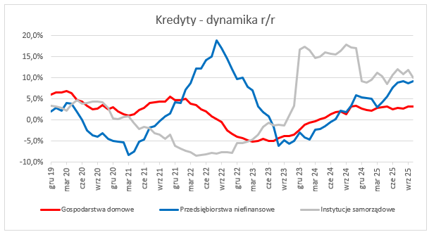 Zazwyczaj po październiku oczekuje się, że przyniesie wzrost kredytów w tej grupie klientów. W tym roku w październiku wydatki konsumentów były wyższe niż oczekiwano (większy mógł być więc też popyt na kredyt konsumencki). Dziewiętnasty miesiąc z rzędu notowana jest dodatnia roczna dynamika kredytów (choć wciąż niewysoka).