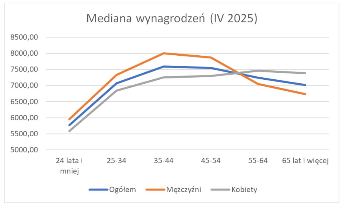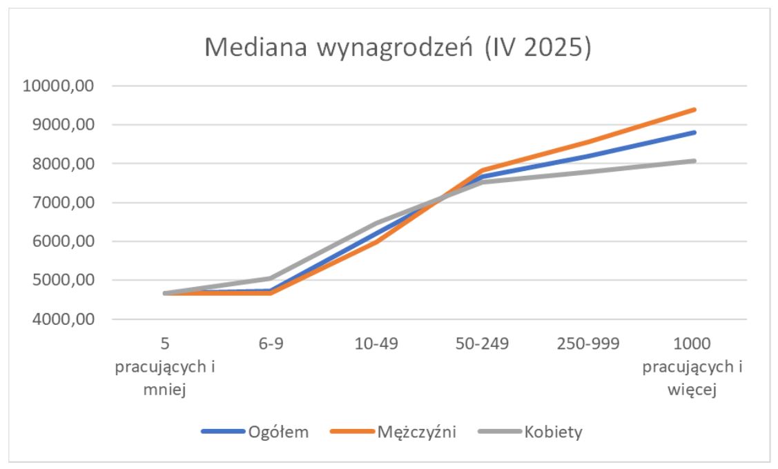 Główny Urząd Statystyczny opublikował dane dotyczące struktury wynagrodzeń w gospodarce narodowej w kwietniu 2025 roku. Dane obejmują pełną zbiorowość zatrudnionych (zarówno sektor przedsiębiorstw, jak i inne sektory) i prezentowane są w podziale m.in. na płeć, wiek zatrudnionych, miejsce zamieszkania, wielkość podmiotu, branżę i miejsce siedziby podmiotu. Uwzględniają również medianę wynagrodzeń.