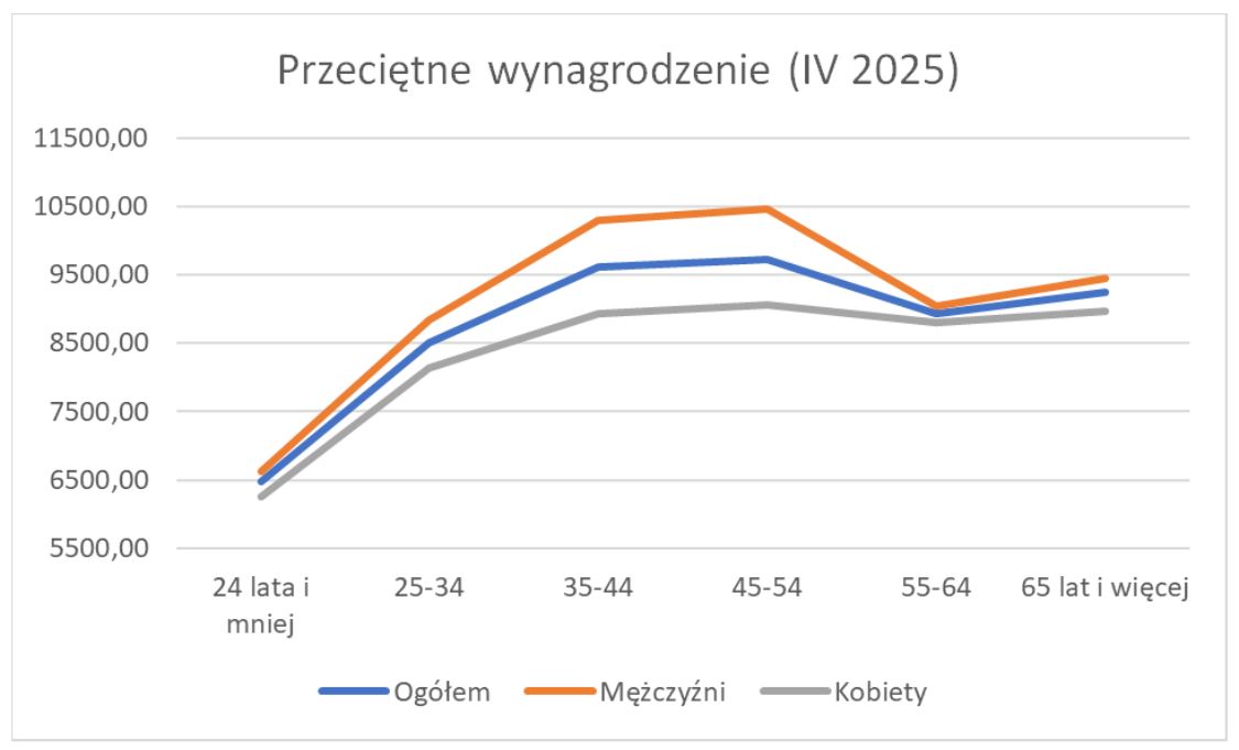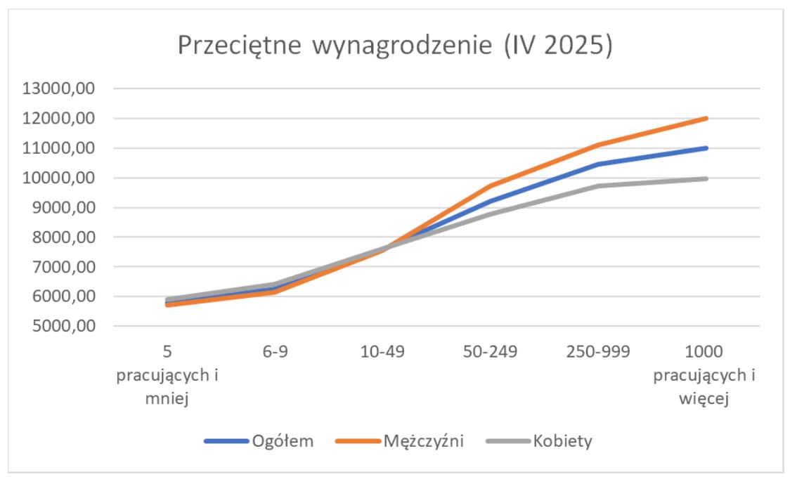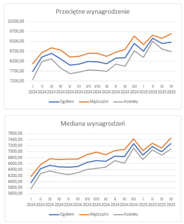 - W kwietniu 2025 r. przeciętne miesięczne wynagrodzenie w gospodarce narodowej w przypadku mężczyzn wyniosło 9 593,52 PLN (mediana – 7 451,00 PLN), a kobiet 8 690,04 PLN (mediana – 7 083,20 PLN).
