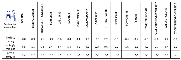 Dane w podziale na województwa pokazują, że najwyższy wskaźnik koniunktury w przetwórstwie w październiku br. zanotowało województwo mazowieckie (plus 4,5), a najniższy – województwo opolskie (minus 12,8). Dodatni wskaźnik występuje w 3 województwach, w pozostałych 13 jest ujemny.