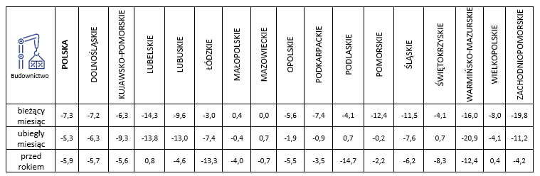 W stosunku do poprzedniego miesiąca wskaźnik koniunktury poprawił się w 8 województwach, w 4  pogorszył, a w 4 pozostał bez zmian. Najwyższy wzrost widoczny jest w województwie podlaskim (z plus 4,1 przed miesiącem do plus 10,8 obecnie), a największy spadek – w lubuskim (z plus 3,7 przed miesiącem do minus 21,2 obecnie).