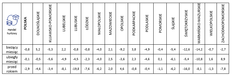 Dane wojewódzkie pokazują, że najwyższy wskaźnik koniunktury w handlu hurtowym w październiku br. zanotowało województwo dolnośląskie (plus 5,2), a najniższy – województwo warmińsko-mazurskie (minus 14,2). Dodatni wskaźnik występuje w 4 województwach, w pozostałych 12 jest ujemny.