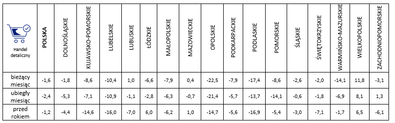 Dane wojewódzkie pokazują, że najwyższy wskaźnik koniunktury w handlu detalicznym w październiku br. zanotowało województwo wielkopolskie (plus 11,8), a najniższy – województwo opolskie (minus 22,5). Dodatni wskaźnik występuje w 3 województwach, w pozostałych 13 jest ujemny.