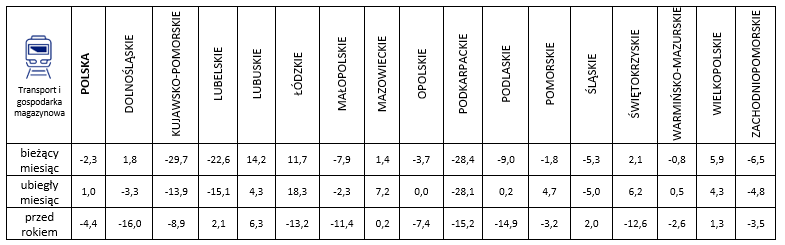 Dane wojewódzkie pokazują, że najwyższy wskaźnik koniunktury w transporcie i gospodarce magazynowej w październiku br. zanotowało województwo lubuskie (plus 14,2), a najniższy – województwo podkarpackie (minus 28,4). Dodatni wskaźnik występuje w 6 województwach, w pozostałych 10 jest ujemny.