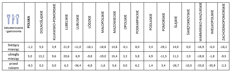 Dane wojewódzkie pokazują, że najwyższy wskaźnik koniunktury w zakwaterowaniu i gastronomii w październiku br. zanotowało województwo lubelskie (plus 21,9), a najniższy – województwo pomorskie (minus 29,1). Dodatni wskaźnik występuje w 7 województwach, w 8 jest ujemny, w jednym neutralny.