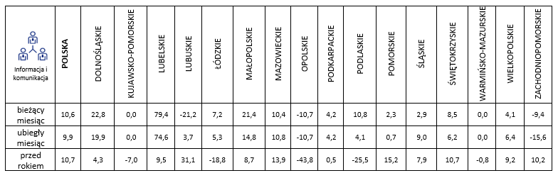 Dane wojewódzkie pokazują, że najwyższy wskaźnik koniunktury w informacji i komunikacji w październiku br. zanotowało województwo lubelskie (plus 79,4), a najniższy – województwo lubuskie (minus 21,2). Dodatni wskaźnik występuje w 11 województwach, w 3 jest ujemny, w 2 neutralny.