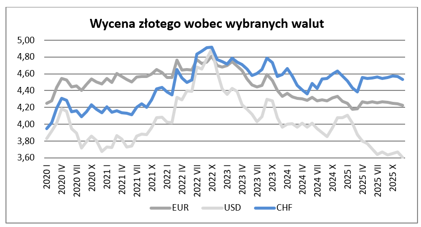 W grudniu wycena złotego wobec euro uległa wzmocnieniu w stosunku do notowanej w listopadzie o 0,35% i wyniosła 4,2251. Równocześnie okazała się o 1,1% mocniejsza niż przed rokiem (w listopadzie złoty był mocniejszy niż przed rokiem o 2,2%).