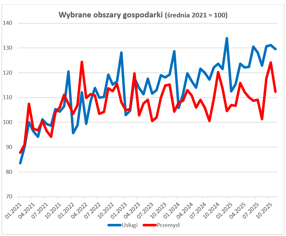 W stosunku do listopada 2024 roku produkcja usług wzrosła we wszystkich kategoriach. Wyniki prezentowały się następująco: działalność profesjonalna, naukowa i techniczna – wzrost o 15,7%; działalność związana z obsługą rynku nieruchomości – wzrost o 7,3%; informacja i komunikacja – wzrost o 6,3%; działalność związana z zakwaterowaniem i usługami gastronomicznymi – wzrost o 5,8%; transport i gospodarka magazynowa – wzrost o 2,9%; działalność w zakresie usług administrowania i działalność wspierająca – wzrost o 2,3%.