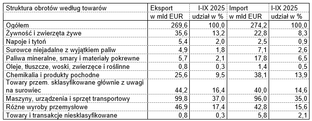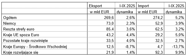 W okresie styczeń-wrzesień 2025 roku w wymianie towarowej odnotowany został deficyt sięgający 4,6 mld EUR. Wyniki z poszczególnymi krajami czy grupami krajów były mocno zróżnicowane. W przypadku Niemiec osiągnęliśmy nadwyżkę na poziomie 20,1 mld EUR. Z pozostałymi krajami strefy euro wypracowaliśmy nadwyżkę w kwocie 22,9 mld EUR. Z krajami UE pozostającymi poza strefą euro osiągnięta została nadwyżka w wysokości 14,0 mld EUR. W przypadku krajów wysokorozwiniętych spoza UE zanotowana został nadwyżka 1,0 mld EUR. Z krajami Europy Środkowej i Wschodniej w wymianie mieliśmy nadwyżkę na poziomie 7,8 mld EUR. Deficyt notujemy w przypadku wymiany z krajami rozwijającymi się – 70,4 mld EUR (głównie za sprawą deficytu w wymianie z Chinami).