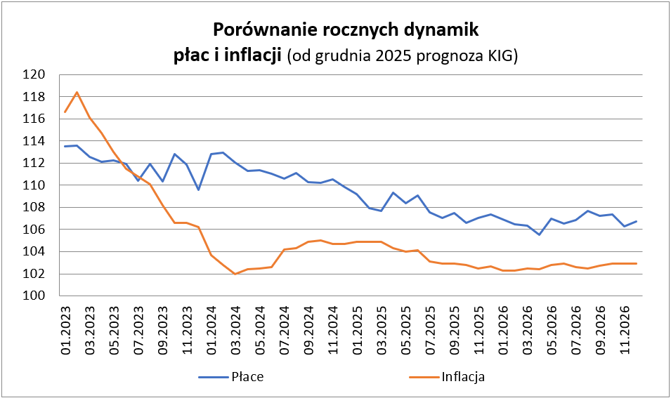 W ostatnich miesiącach ponownie pojawiło się falowanie rocznej dynamiki płac. Wynika ono głównie z innego niż przed rokiem terminarza wypłat ruchomych części wynagrodzeń takich jak premie i nagrody. W kolejnych miesiącach należy oczekiwać początkowo utrzymania rocznej dynamiki płac na zbliżonym do dzisiejszego poziomie, a następnie stopniowego jej spadku, wraz z obniżaniem się inflacji. Dynamika płac pozostawać będzie jednak powyżej dynamiki inflacji. Pojawiać się bowiem będą czynniki zazwyczaj odpowiedzialne za dynamizację płac. Znów przyspieszy zmiana struktury zatrudnienia (kiedy powstają nowe lepiej płatne miejsca pracy, a te mniej atrakcyjne są opuszczane przez pracowników).