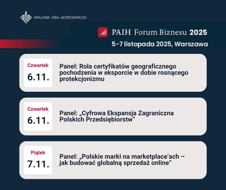 Krajowa Izba Gospodarcza weźmie udział w PAIH Forum Biznesu 2025. Wydarzenie odbędzie się 5-7 listopada 2025 r. na Stadionie PGE Narodowym w Warszawie. Naszych ekspertów spotkacie w aż trzech dyskusjach panelowych, podczas których poruszymy tematy od certyfikatów geograficznego pochodzenia po e-eksport. Panel „Polskie marki na marketplace’ach – jak budować globalną sprzedaż online” jest w całości organizowany przez naszą inicjatywę dla przedsiębiorców: cross-border.pl. Wstęp na całe wydarzenie bezpłatny. Obowiązują zapisy.
