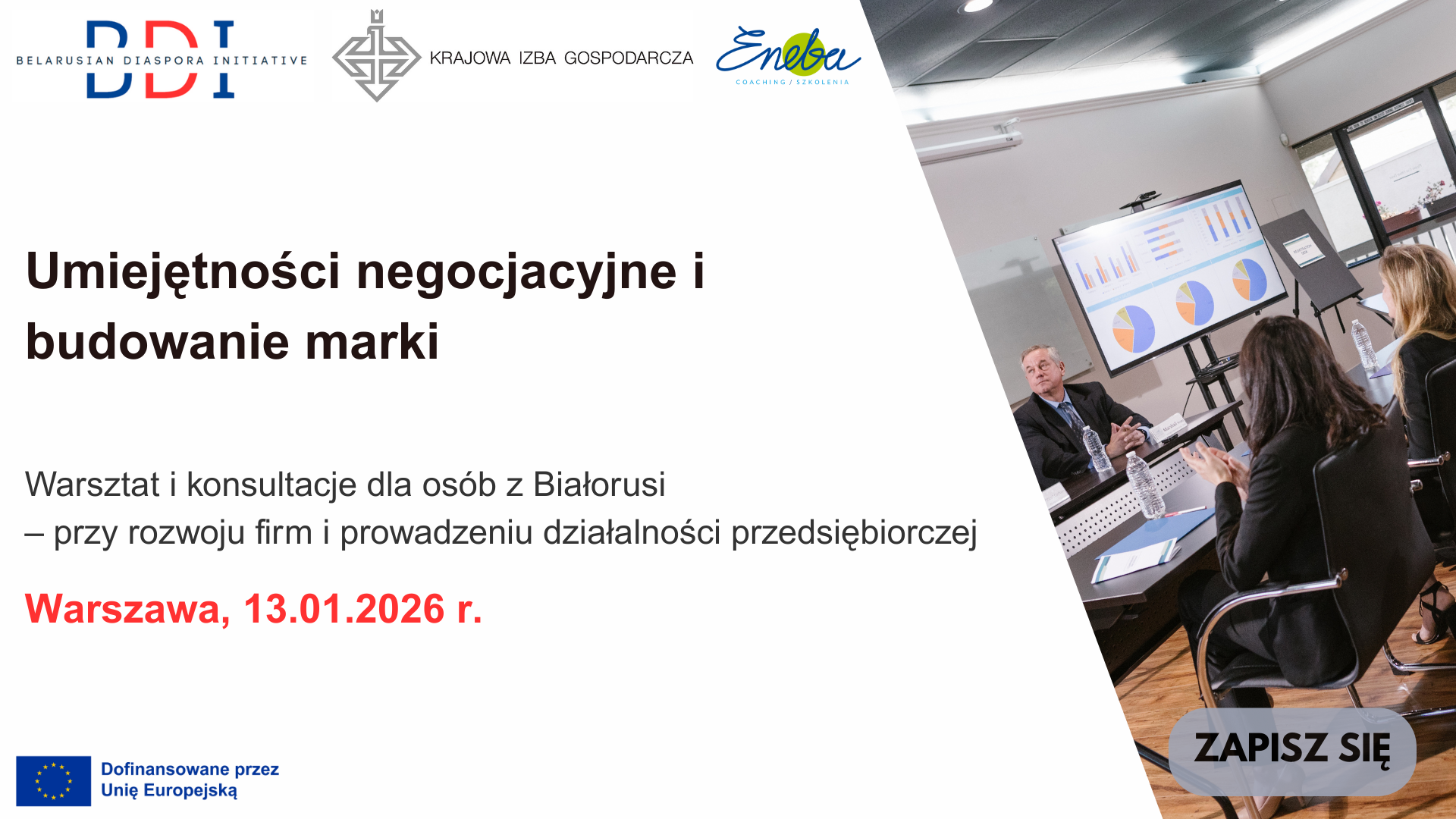 W ramach projektu Belarusian Diaspora Initiative (BDI) zapraszamy na praktyczny warsztat poświęcony negocjacjom biznesowym oraz budowaniu marki – kluczowym kompetencjom niezbędnym w codziennym prowadzeniu firmy. Spotkanie skierowane jest do białoruskich przedsiębiorców i osób planujących rozpoczęcie działalności gospodarczej w Polsce.